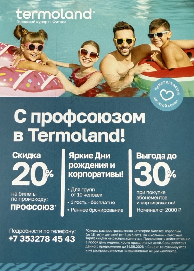 Теперь все члены профсоюза могут воспользоваться купонами со скидкой 20 % на посещение термального комплекса. Это наш совместный вклад в здоровье и качественный отдых коллектива. Скидочные купоны Вас уже ожидают, спрашивать в своих профсоюзных организациях.![]()